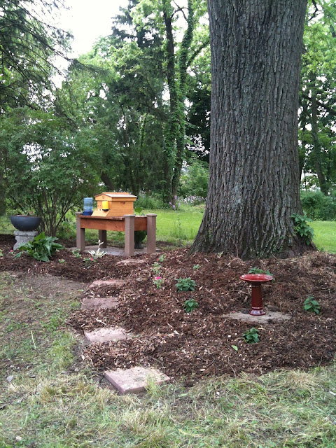 The fist big decision was to figure out where to put the bees. They have a home on the "master plan" but the problem is that the area where they need to live eventually is right in the traffic lane for a couple of other as-of-yet-incomplete projects including replacing the shed. Since bees don't really appreciate a lot of noise and attention I figured it would probably be best if I put them somewhere else for the time being. The absolutely ideal place is down by the windmill, but as that's the lowest point in the yard and was under 3 feet of water during last September's flood I decided that probably wasn't the smartest place either. I settled for a relatively flat spot next to the big walnut tree in the middle of the yard.
